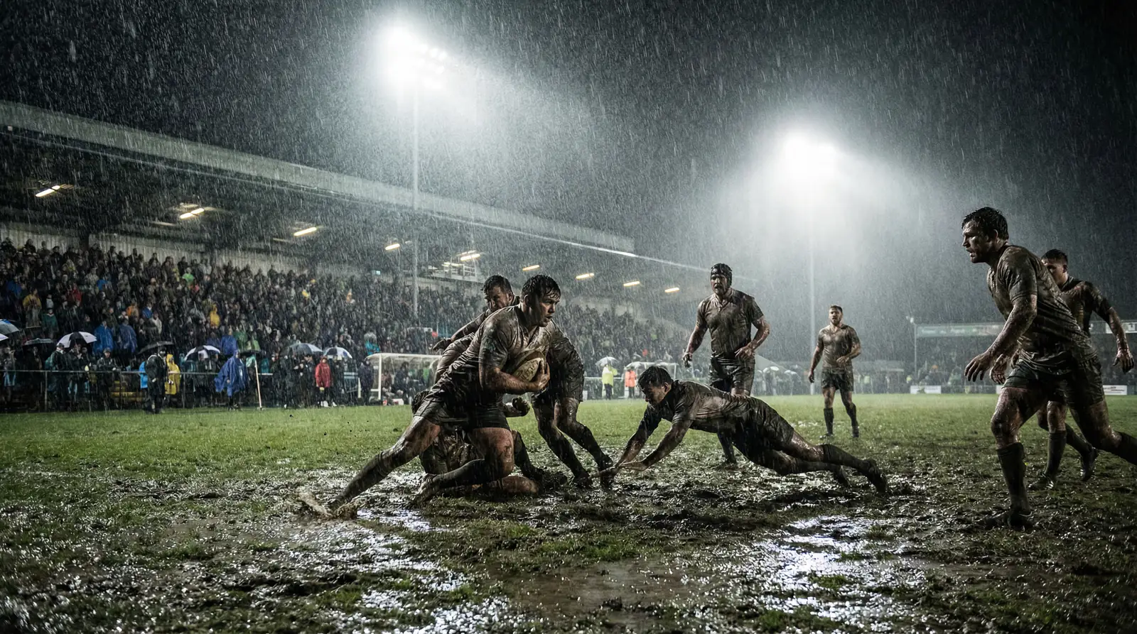 La pluie est le facteur météo le plus impactant au rugby. Un ballon mouillé est un ballon glissant, ce qui augmente les en-avant (erreurs de manipulation), réduit la précision des passes et rend les phases de jeu au large plus risquées. Les équipes s’adaptent en privilégiant le jeu au pied, la mêlée et les rucks serrés — un rugby de combat plutôt qu’un rugby de mouvement.